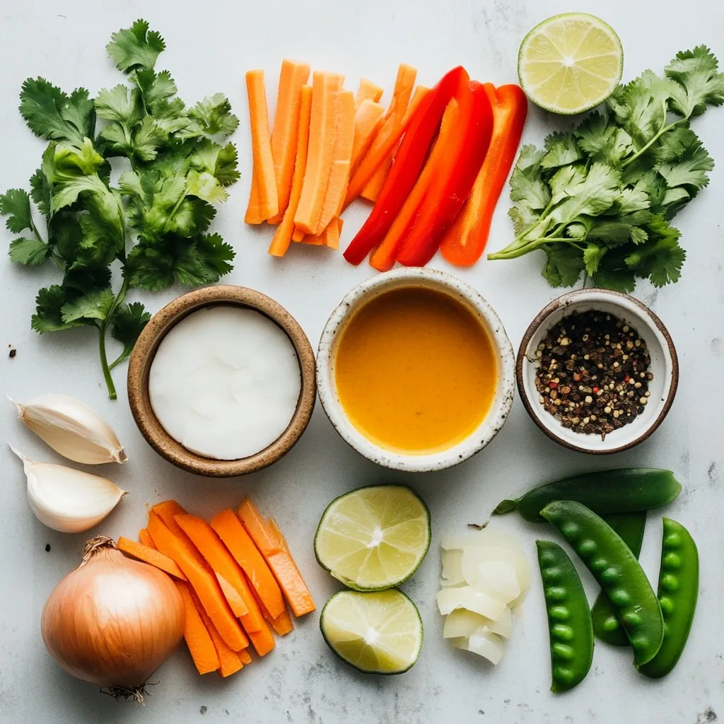 Coconut milk provides a silky texture, while vegetable broth offers a savory foundation. The carrots, red bell pepper, and snap peas contribute color and crunch. Lastly, soy sauce and lime juice add umami and brightness.