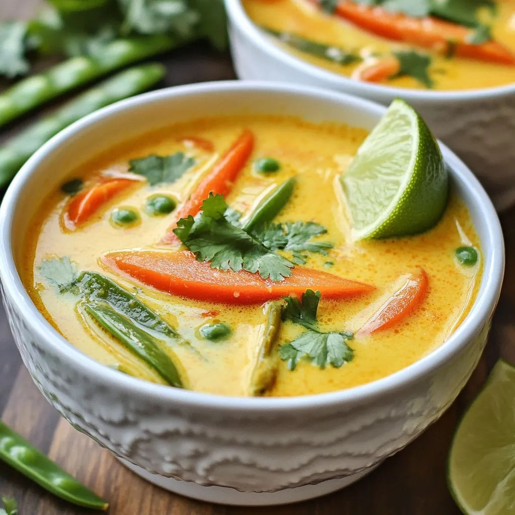 To make Addictive Coconut Curry Soup, gather these key ingredients: - 1 tablespoon coconut oil - 1 medium onion, diced - 3 cloves garlic, minced - 1 tablespoon fresh ginger, grated - 2 tablespoons red curry paste - 1 can (400ml) coconut milk - 3 cups vegetable broth - 2 medium carrots, sliced into thin rounds - 1 red bell pepper, sliced into strips - 1 cup snap peas, trimmed - 1 tablespoon soy sauce - 1 tablespoon freshly squeezed lime juice - Salt and pepper to taste - Fresh cilantro leaves, for garnish - Lime wedges, for serving These ingredients work together to create a rich and creamy soup. The coconut oil starts the cooking process with a delightful base. Onion, garlic, and ginger bring warmth and depth of flavor. Red curry paste adds a spicy kick, making your taste buds dance. Coconut milk provides a silky texture, while vegetable broth offers a savory foundation. The carrots, red bell pepper, and snap peas contribute color and crunch. Lastly, soy sauce and lime juice add umami and brightness. You can adjust the seasoning to fit your taste. Use salt and pepper to make it just right. Fresh cilantro and lime wedges elevate the presentation and flavor. Enjoy this simple yet flavorful soup! {{ingredient_image_2}} 1. Sautéing onion, garlic, and ginger Start by melting the coconut oil in a large pot over medium heat. Add the diced onion. Sauté it for about five minutes. You want the onion to become soft and clear. Next, add the minced garlic and grated ginger. Stir them in and cook for one to two minutes. The mix should smell nice and warm. 2. Adding curry paste for flavor Next, introduce the red curry paste. Stir well to coat the onion mix. Cook this for another minute. This step is key for getting that deep flavor. 3. Mixing in coconut milk and broth Slowly pour in the coconut milk and vegetable broth. Stir continuously to blend everything. This creates a smooth and creamy base for your soup. 1. Incorporating vegetables and simmering Turn the heat up a bit and bring the mix to a gentle simmer. Once it starts bubbling, add the sliced carrots and red bell pepper. Cook these for about ten minutes. Check that they are fork-tender, meaning they should be soft but still hold shape. 2. Final seasoning adjustments Now stir in the snap peas and cook for another three to four minutes. They should be bright green and tender-crisp. After that, add the soy sauce and fresh lime juice. Taste your soup and adjust the salt and pepper as needed. 3. Cooling and preparing for serving Once done, remove the pot from the heat. Let the soup cool for a few minutes before serving. This helps the flavors settle and makes it easier to enjoy. Serve the soup in deep bowls. Top it with fresh cilantro leaves and a lime wedge. Enjoy your delicious creation! To make your coconut curry soup even better, focus on the spice levels. You can adjust the heat by adding more or less red curry paste. Start with one tablespoon for a mild flavor. If you like it spicier, add more paste. Taste as you go to find your perfect level. Fresh herbs add a great aroma. I love using cilantro. Chop it finely and sprinkle it on top just before serving. You can use basil or mint too for a fresh twist. They bring a bright flavor that lifts the soup. Serving this soup can be fun and creative. Use deep bowls to show off the vibrant colors. Add a handful of fresh cilantro leaves on top for a pop of green. A wedge of lime on the side not only looks nice, but it adds a zesty kick when you squeeze it in. For sides, steamed rice pairs well with this soup. It soaks up the rich broth. If you prefer bread, a slice of crusty bread complements the soup perfectly. It makes for a hearty meal that is sure to please everyone at the table. Pro Tips Use Fresh Ingredients: Fresh vegetables and herbs will enhance the flavor profile of your soup, making it more vibrant and delicious. Adjust Spice Levels: If you like your soup spicier, feel free to add more red curry paste or a pinch of chili flakes to suit your taste. Creamy Texture: For an extra creamy texture, blend a portion of the soup and then stir it back in before serving. Garnish for Flavor: Don't skip the fresh cilantro and lime wedges; they add a burst of flavor and elevate the dish significantly. {{image_4}} You can change the vegetables in this soup to match your tastes. Here are some great options: - Broccoli: Adds a nice crunch. - Zucchini: Soft and mild, it blends well. - Spinach: Stir it in at the end for extra greens. - Mushrooms: They give a meaty texture and rich flavor. You can also add protein to make this dish heartier. Here are some ideas: - Tofu: Use firm or extra-firm tofu. Cube it and sauté with onions. - Chicken: Cook diced chicken breast until golden before adding to the soup. - Shrimp: Add raw shrimp near the end for a quick cook. You can change the taste by using different curry pastes. Here are some options: - Green curry paste: Gives a fresher and spicier flavor. - Massaman curry paste: Adds warmth and depth with spices. - Yellow curry paste: Milder and slightly sweet, perfect for kids. Try adding extra seasonings and herbs to boost flavor: - Lemongrass: Adds a bright, citrusy note. - Basil: Fresh Thai basil gives a sweet fragrance. - Cilantro: Use more for a punch of freshness. These swaps and additions let you make this soup your own! Enjoy experimenting. To keep your Addictive Coconut Curry Soup fresh, store it in the fridge. Use an airtight container. This helps keep the soup tasty for up to three days. If you want to save it longer, consider freezing it. Pour the cooled soup into freezer-safe bags. Remove as much air as possible to prevent freezer burn. You can freeze the soup for up to three months. When you’re ready to eat, let it thaw in the fridge overnight. When reheating your soup, you want to keep the flavors intact. The best method is to use the stove. Pour the soup into a pot and heat it over low to medium heat. Stir occasionally to avoid sticking. This helps main