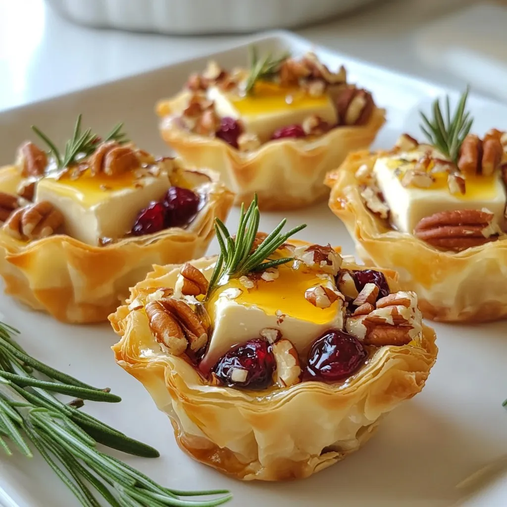 Delicious phyllo cups filled with Brie cheese, cranberries, and pecans, perfect for appetizers.