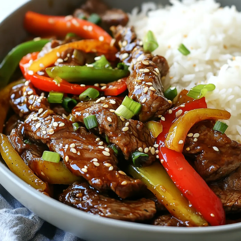 How you plate your dish can make it special. Serve in a large, shallow bowl. This showcases the colorful steak and veggies. Use a mound of jasmine rice or noodles on the side. It soaks up all the tasty sauce. For garnish, sprinkle green onions and sesame seeds on top. This adds a nice touch and makes it look fancy.