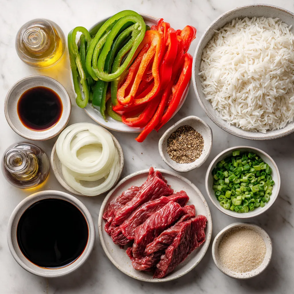 When you prepare this dish, gather all these ingredients first. The flank steak gives the dish its tender texture. The green and red bell peppers add vibrant colors and crunch. The onion brings sweetness and flavor.