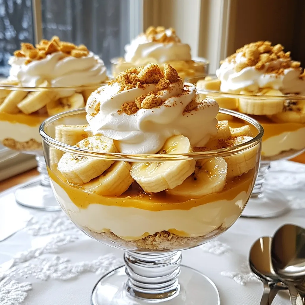 - Ripe bananas - Eggnog (store-bought or homemade) - Heavy cream - Powdered sugar - Vanilla extract - Vanilla wafers - Ground nutmeg - Whipped cream for topping - Crushed graham crackers for garnish (optional) Gather these ingredients for your Christmas Eggnog Banana Pudding. Start with ripe bananas. Their sweetness adds flavor. You need two bananas, sliced. Next, you will need eggnog. You can use store-bought or make your own. Use two cups for good measure. Heavy cream is also key. You’ll need one cup. This makes your pudding creamy and smooth. For sweetness, add half a cup of powdered sugar. You will also need one teaspoon of vanilla extract for a rich flavor. Vanilla wafers are next. They form the base and layer. Use three cups for full layers. A pinch of nutmeg adds warmth. Use half a teaspoon for a holiday touch. Finally, have whipped cream ready for topping. You can also sprinkle crushed graham crackers on top. They add crunch and look festive. With these ingredients, you are ready to create a delightful holiday treat. {{ingredient_image_2}} First, grab a medium bowl. Pour in 1 cup of heavy cream. Use an electric mixer on medium speed. Whip the cream until soft peaks start to form. Next, sprinkle in 1/2 cup of powdered sugar. Add 1 teaspoon of vanilla extract. Now, increase the mixer speed to high. Whip the cream until stiff peaks form. This whipped cream will be fluffy and light. Set it aside for later use. In another bowl, pour in 2 cups of eggnog. This can be store-bought or homemade. Whisk in 1/2 teaspoon of ground nutmeg. Mixing in the nutmeg adds a warm flavor to the eggnog. Make sure it’s fully combined. This step is key for a tasty pudding. Select a large serving dish or individual cups. Start by arranging a layer of vanilla wafers at the bottom. Ensure the wafers cover the entire base. This helps create a solid foundation. Next, gently pour a layer of the eggnog mixture over the wafers. Let them soak for a few moments. This enhances their flavor and gives great texture. Now, add a layer of sliced bananas on top of the eggnog-soaked wafers. Spread the bananas evenly. This ensures that every bite has delightful fruit. Spoon a generous layer of whipped cream over the bananas. This creates a fluffy topping that everyone loves. Repeat the layering process. Add more vanilla wafers, followed by the eggnog mixture, sliced bananas, and whipped cream. Keep going until the dish is filled to the top. Finish with a final layer of whipped cream for a pretty look. Cover the dish with plastic wrap or a lid. Refrigerate for at least 4 hours. For the best results, let it chill overnight. This allows all the flavors to meld together. The pudding will set perfectly. Just before serving, sprinkle crushed graham crackers on top. This adds a delightful crunch and a festive touch that impresses. - Using fresh ingredients: Always pick ripe bananas. Fresh bananas add natural sweetness and flavor. Use high-quality eggnog for the best taste. This makes a big difference in your pudding. - Importance of chilling time: Chill the pudding for at least four hours. For best results, let it sit overnight. This time allows the flavors to blend well. It also helps the pudding set up nicely. - Presentation ideas: Serve this pudding in clear glass bowls. This shows off the beautiful layers. Each layer looks stunning, and it adds to the festive spirit. - Garnishing tips with nutmeg and banana slices: Just before serving, sprinkle nutmeg on top. Add a few banana slices for a fresh touch. This makes your dessert look even more inviting. - Overwhipping cream: Whip the cream until stiff peaks form. If you whip too long, the cream may turn grainy. Watch it closely as you mix. - Not allowing time to set: Do not skip the chilling time. If you serve it too soon, the layers may run together. Giving it time to set improves both texture and flavor. Pro Tips Use Ripe Bananas: Ensure your bananas are perfectly ripe for the best flavor and sweetness in your pudding. Chill the Pudding: Allow the pudding to chill overnight for the best texture and flavor infusion. Experiment with Eggnog: Try different brands or homemade eggnog to customize the taste according to your preference. Add a Touch of Rum: For an adult twist, consider adding a splash of rum to the eggnog mixture for extra holiday cheer. {{image_4}} You can add extra spices to your eggnog banana pudding. A pinch of cinnamon or cloves gives warmth and depth. These spices enhance the holiday spirit. You could even layer in some chocolate or caramel. The rich flavors will surprise and delight your guests. If you need a gluten-free option, swap vanilla wafers with gluten-free cookies. This small change keeps the taste while ensuring everyone can enjoy it. For a dairy-free treat, use coconut cream instead of heavy cream. Almond milk can replace eggnog for a lighter, dairy-free version. Both options taste amazing while catering to different diets. You can easily scale the recipe for more guests. Just double or triple the ingredients as needed. For larger gatherings, serve in a big dish. Individual servings in cups make it easy for guests to grab. They also look cute and festive on the table. This Christmas Eggnog Banana Pudding can last up to three days in the fridge. For the best taste and texture, cover the pudding tightly. Use plastic wrap or a lid to keep air out. This will help it stay fresh. For storage containers, choose a glass or plastic dish with a lid. These containers keep the pudding safe from smells and help it last longer. You can also use individual cups for single servings. This makes it easy to grab and enjoy. Yes, you can freeze this pudding! It can last up to two months in the freezer. Use an airtight container to prevent freezer burn. Make sure to leave some space at the top, as pudding can expand when frozen. When it’s time to enjoy it, thaw the pudding in the fridge overnight. This will help maintain its creamy texture. Avoid using a microwave, as 