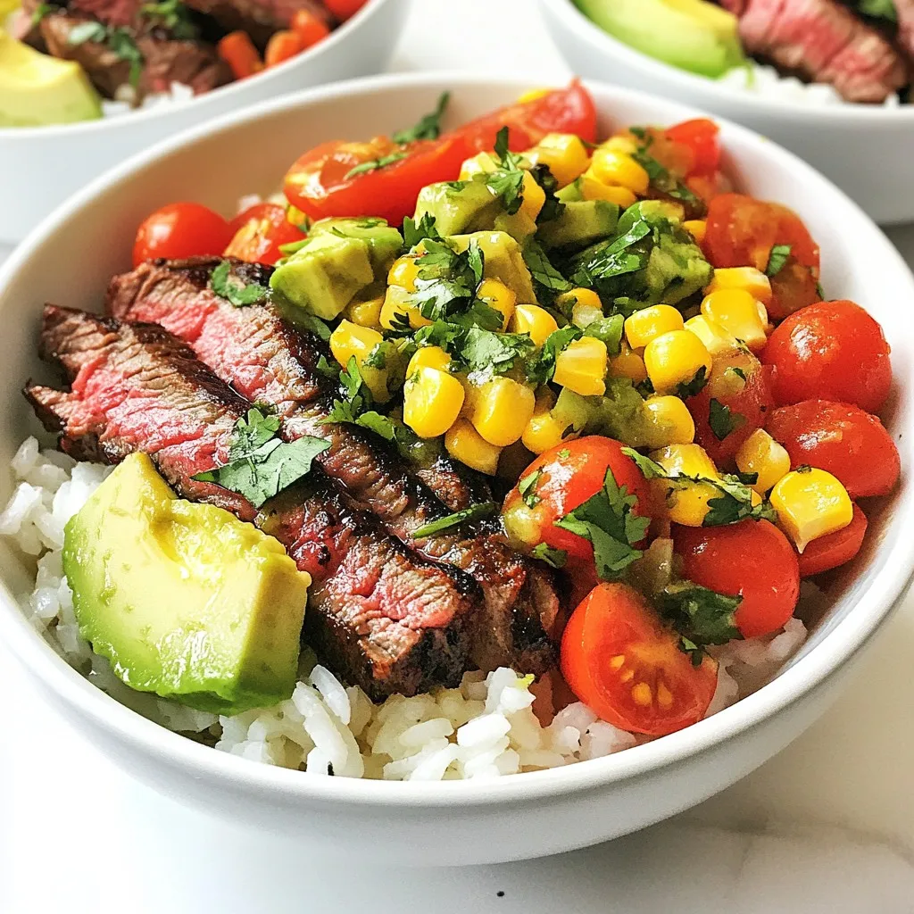 – Colorful layering techniques: When you assemble the bowls, layer the ingredients. Start with fluffy rice, then add sliced steak, cherry tomatoes, corn, and avocado. This makes it look inviting and fun to eat.