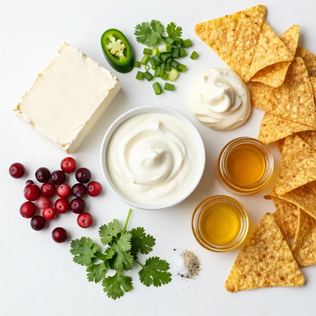 To start making your cranberry jalapeño dip, gather all your ingredients. You need fresh or frozen cranberries, a small jalapeño, cream cheese, sour cream, mayonnaise, green onions, honey, garlic powder, salt, and pepper. You’ll also want some tortilla chips or crackers for serving.