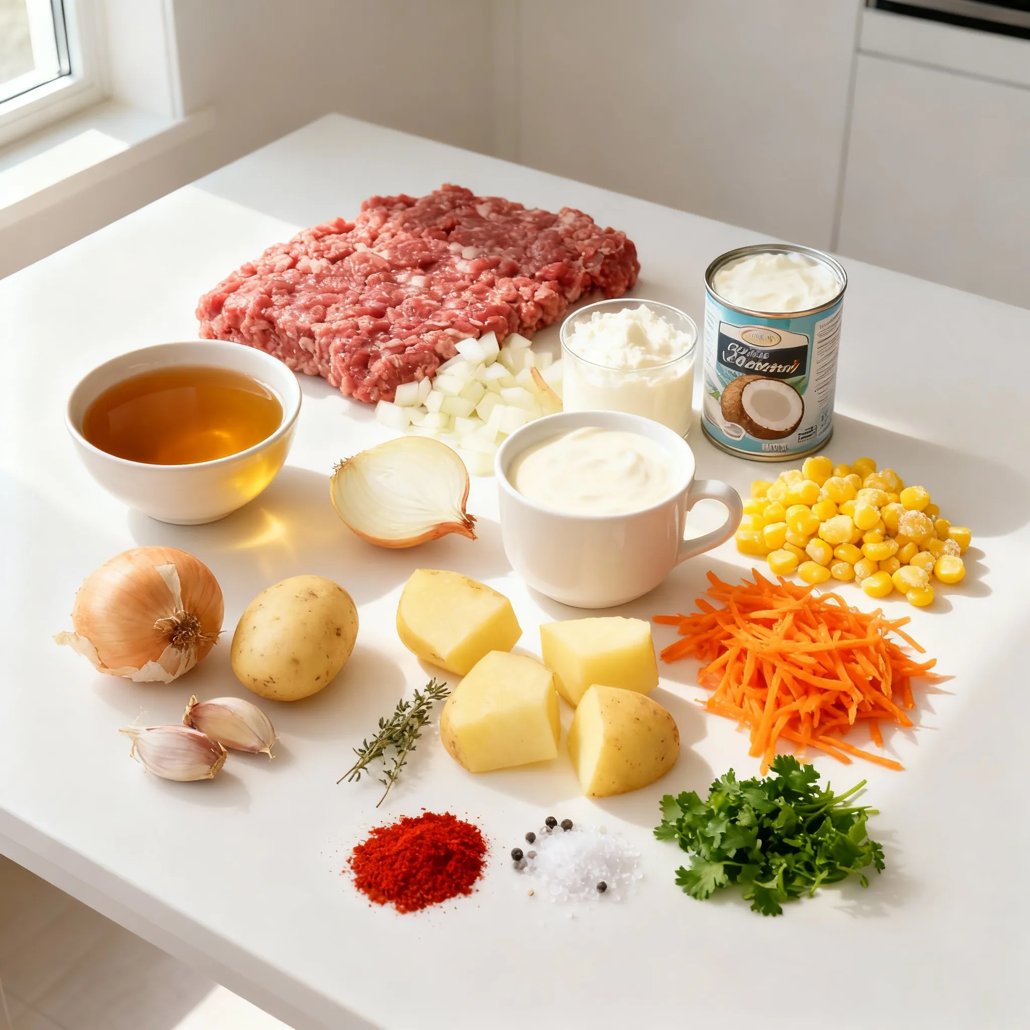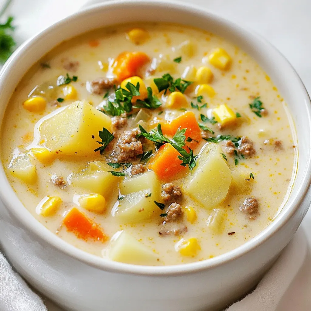 A comforting and creamy soup made with ground beef, potatoes, and vegetables, perfect for chilly days.