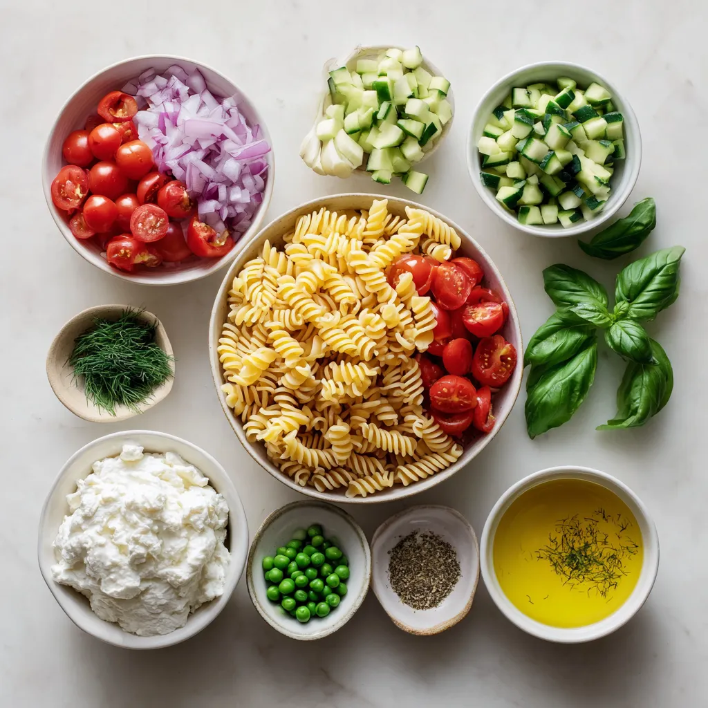 When I make this creamy summer pasta salad, I find joy in its simple ingredients. Each part plays a role in the dish’s vibrant flavors and textures.