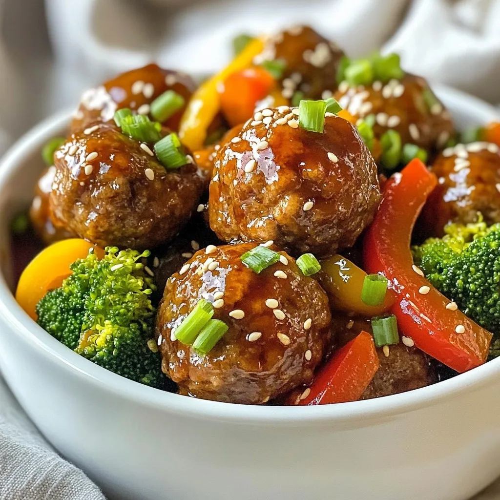 Delicious meatballs made with ground beef or turkey, flavored with Asian ingredients, and cooked in a savory teriyaki sauce with vegetables.
