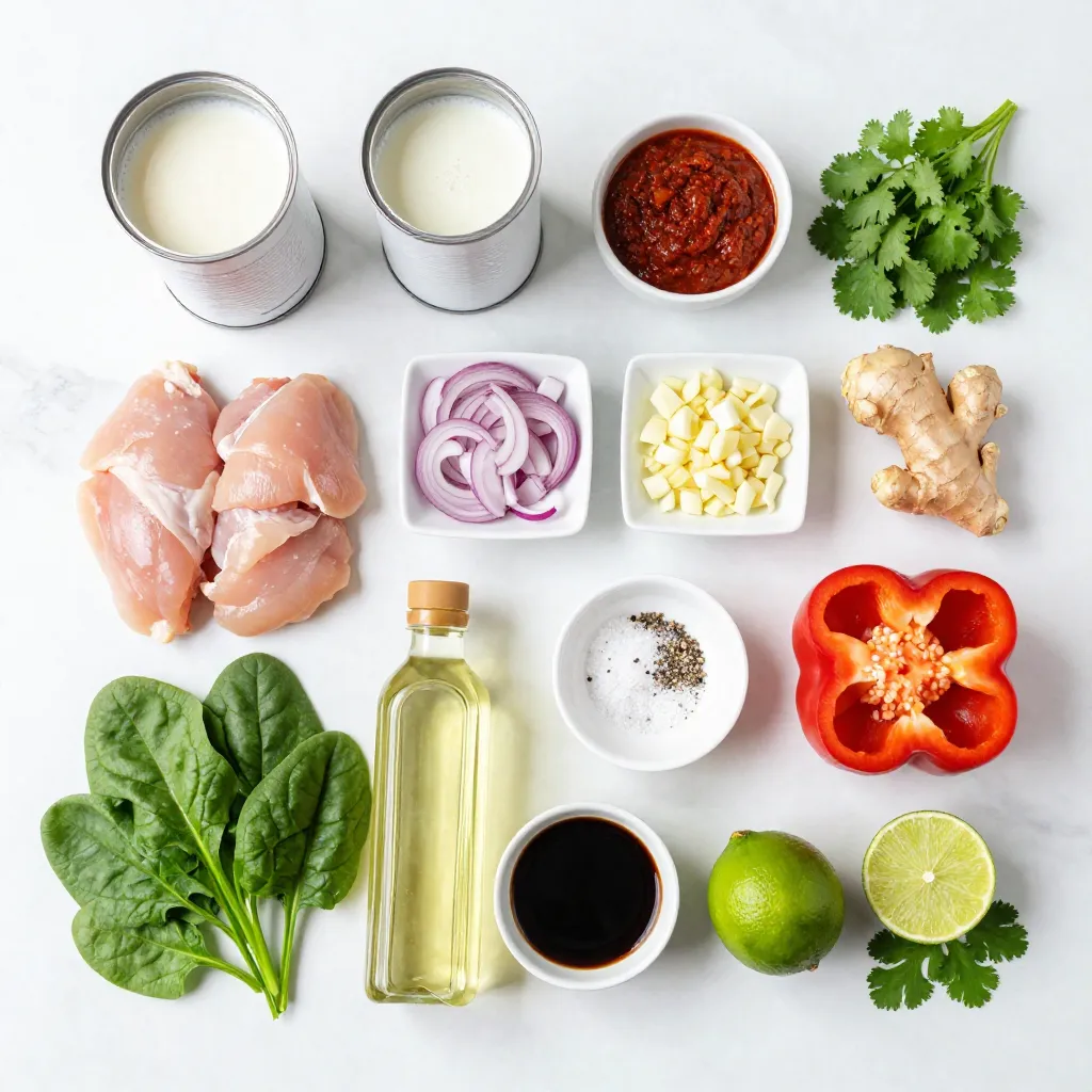 - 1 lb boneless chicken thighs - 1 can coconut milk - 2 tablespoons red curry paste - Onion - Garlic - Fresh ginger - Red bell pepper - Fresh spinach - Soy sauce and lime juice The main ingredients set the stage for a delightful dish. Boneless chicken thighs bring richness to the curry. They cook well and stay juicy, making each bite tender. Coconut milk adds creaminess and a hint of sweetness. It balances the spice of the red curry paste, which provides depth and warmth. Aromatics like onion, garlic, and fresh ginger create a fragrant base. Start by sautéing the onion until soft. Then, add minced garlic and grated ginger. This mix fills your kitchen with inviting scents. The vegetables and seasoning give the dish color and flavor. Red bell pepper adds crunch and sweetness, while fresh spinach offers a vibrant green touch. The soy sauce and lime juice bring a savory and tangy kick, enhancing the overall taste. Together, these ingredients create a simple yet flavorful dish. You can easily adapt them to suit your taste. Whether you want more spice or prefer a milder flavor, this recipe is flexible. Enjoy making your coconut chicken curry just the way you like it! {{ingredient_image_2}} 1. Heat 2 tablespoons of vegetable oil in a large skillet over medium heat. 2. Add 1 medium onion, finely chopped. Sauté for about 5 minutes. The onion should be soft and clear. 3. Next, stir in 3 minced garlic cloves and 1 tablespoon of freshly grated ginger. Cook for 1 minute until the smell is strong. 4. Add 1 pound of cubed boneless chicken thighs to the skillet. Cook for 6-7 minutes. The chicken should be browned and no longer pink. 1. Mix in 2 tablespoons of red curry paste. Make sure the chicken is coated well. Cook for 2 more minutes to blend the flavors. 2. Slowly pour in 1 can of coconut milk. Stir to mix everything together. Bring it to a gentle simmer. 1. Add 1 sliced red bell pepper. Cook for 5-7 minutes. The bell pepper should be soft but still crunchy. 2. Gently fold in 1 cup of fresh spinach leaves. Cook until they wilt, about 2 minutes. 3. Drizzle in 1 tablespoon of soy sauce and 1 tablespoon of lime juice. Season with salt and pepper to taste. 4. Serve your coconut chicken curry warm over jasmine rice or quinoa. Garnish with fresh cilantro leaves for a bright touch. - Ensure chicken is well-browned: Browning the chicken adds depth and flavor. Cook it for about 6-7 minutes. Stir often to avoid burning. - Simmer for flavor development: After adding the coconut milk, let it simmer gently. This helps all the flavors blend well together. - Using fresh cilantro for garnish: Sprinkle chopped cilantro on top for a pop of color. It also adds a fresh taste to the dish. - Serving suggestions with lime wedges: Place lime wedges on the side. A squeeze of lime brightens up the curry. - Overcooking spinach: Add spinach at the end. Cook just until it wilts, keeping its vibrant green color. - Not balancing flavors with lime and soy sauce: Taste the curry before serving. Adjust with lime juice and soy sauce for the best flavor. Pro Tips Use Fresh Ingredients: Fresh chicken and vegetables enhance the flavor and texture of your curry, making it more vibrant and enjoyable. Adjust Spice Levels: Feel free to modify the amount of red curry paste to suit your spice tolerance; start with less and add more if you prefer it spicier. Experiment with Vegetables: This curry is versatile; you can add other vegetables like zucchini, carrots, or snap peas for added nutrition and color. Let It Simmer: Allow the curry to simmer longer for deeper flavors; just be cautious not to overcook the chicken, keeping it tender. {{image_4}} You can make this coconut chicken curry vegetarian. Just swap the chicken for tofu. Use firm tofu and cut it into cubes. Sauté it until golden and add it to the curry. This keeps the dish rich and creamy. For a spicy kick, add fresh chili peppers. Slice them thin and throw them in when cooking the onions. This gives the curry a nice heat. Adjust the amount to match your taste. Get creative with other veggies! Zucchini and carrots are great choices. Just chop them up and add them with the bell peppers. They add color and texture to the dish. You can also try different types of curry paste. Green or yellow curry paste works well too. Each type brings its own flavor. Experiment to find your favorite! Serve this curry with naan or rice. Jasmine rice works best, but quinoa is a tasty option too. Both soak up the sauce nicely. To enhance the meal, add side dishes like a simple salad or roasted veggies. A light cucumber salad can cool off the spice. These sides make your dinner even more satisfying. Store your leftover Easy Coconut Chicken Curry in an airtight container. This keeps it fresh for up to four days. Ensure the curry cools down before sealing it. This helps prevent condensation inside the container, which can lead to soggy curry. To freeze coconut chicken curry, first allow it to cool completely. Then, transfer it to a freezer-safe bag or container. Press out as much air as possible. Label the bag with the date. You can freeze it for up to three months. When ready to eat, thaw it overnight in the fridge. When reheating, do it gently. Pour the curry into a pot over low heat. Stir often to avoid sticking. If the curry looks thick, add a splash of coconut milk or water. This keeps the texture creamy and delicious. You can also reheat it in the microwave. Use a microwave-safe bowl and cover it loosely. Heat in short bursts to maintain the flavor. The spice level in this Easy Coconut Chicken Curry depends on your taste. The red curry paste adds heat, but you can adjust it. If you like it mild, use less curry paste. If you want it spicy, add a bit more. You can also add fresh chili peppers for extra heat. Always taste as you go. This way, you can find the perfect balance for your dish. Yes, you can use frozen chicken thighs for this recipe. Just remember to thaw them first. You can leave them in the