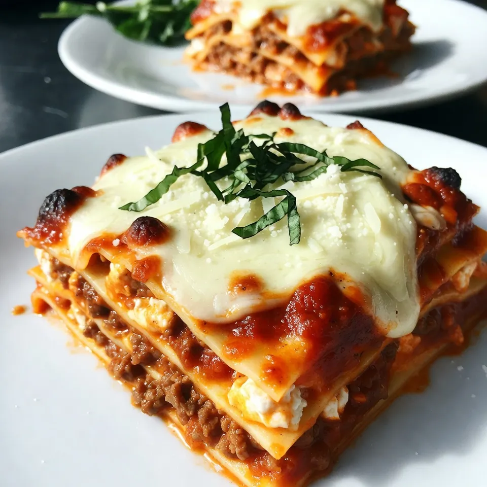 A deliciously layered lasagna filled with cheesy goodness and savory meat sauce.