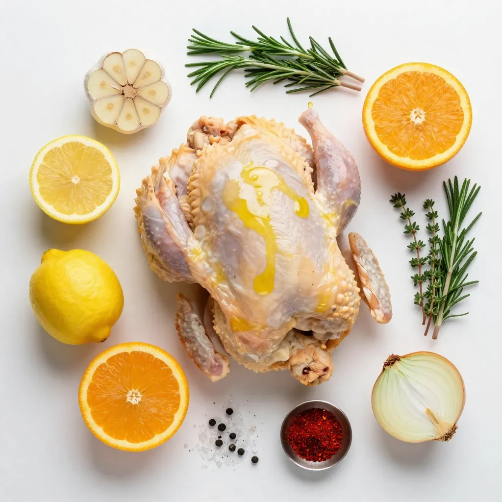 Gather these ingredients before you start. The whole chicken is the star of this dish. Choose one that is around 4 to 5 pounds for the best results. Olive oil adds moisture and flavor, creating a crispy skin. Citrus fruits like lemon and orange add brightness. Garlic infuses the chicken with savory notes. Fresh herbs enhance the taste and aroma.