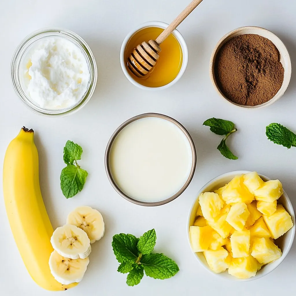 In a high-speed blender, combine the creamy coconut milk, rich eggnog, sliced ripe banana, well-drained crushed pineapple, honey or maple syrup, and ground cinnamon.