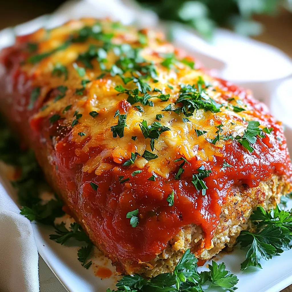 A flavorful meatloaf made with ground chicken, Parmesan cheese, and garlic, topped with marinara sauce.
