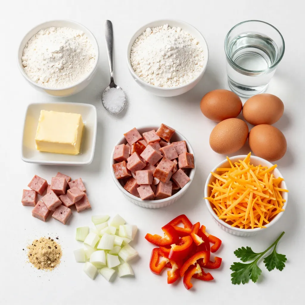 Eggs bind everything together. The sausage or ham adds protein. Cheese gives creaminess, while bell peppers and onions add color and flavor. Garlic powder boosts taste, and salt and pepper season the mix.