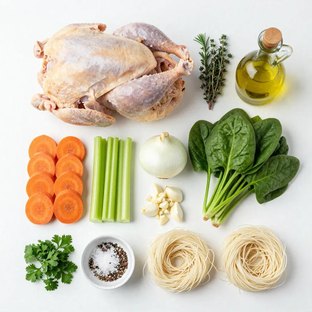 To create a rich and comforting soup, I focus on high-quality ingredients. Using a whole chicken gives your soup depth and flavor. The low-sodium broth adds a savory base without being too salty. When you choose fresh veggies like carrots, celery, onion, and garlic, the aroma alone will make your kitchen feel welcoming. Baby spinach adds a fresh touch and nutrients to the mix.