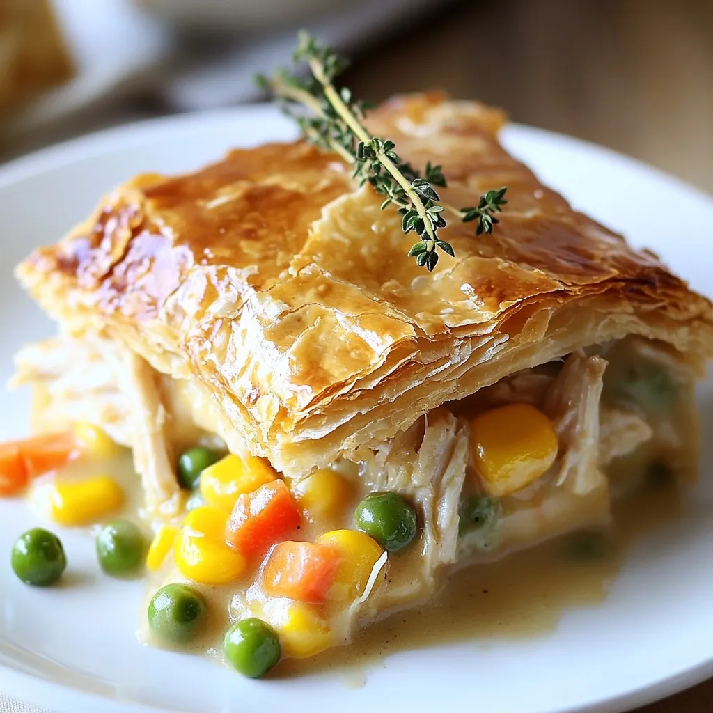 Serve each slice of pot pie on individual plates, garnishing with a sprig of fresh thyme for a touch of elegance. Complement the meal with a refreshing side salad for a delightful dining experience.