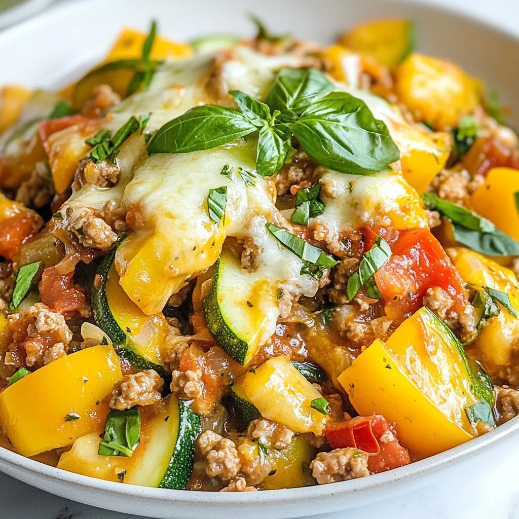 To make a tasty Low-Carb Italian Turkey Skillet, gather these main ingredients: - 1 pound ground turkey - 1 medium zucchini, diced - 1 medium yellow bell pepper, diced - 1 small red onion, finely chopped - 2 cloves garlic, minced - 1 can (14 ounces) diced tomatoes, with juices - 1 teaspoon Italian seasoning - 1/2 teaspoon red pepper flakes (optional) - 1/4 cup fresh basil, chopped - 1/2 cup shredded mozzarella cheese - 2 tablespoons olive oil - Salt and pepper, to taste These ingredients work well together. They create a rich flavor and a nice texture. Ground turkey is lean yet tasty, while the veggies add color and crunch. You may need a few pantry staples for the dish: - Olive oil - Italian seasoning - Salt - Pepper These items are easy to find and should be on hand for many meals. They help boost flavor without adding too many carbs. You can customize the dish with these optional additions: - Add more veggies like spinach or mushrooms for variety. - Swap ground turkey for chicken or beef if you prefer. - Use a different cheese, like provolone or parmesan, for a new taste. Feel free to play with these options. The key is to keep it low-carb but still fun and flavorful! {{ingredient_image_2}} 1. Heat 2 tablespoons of olive oil in a large skillet over medium heat. 2. Add 1 small red onion, finely chopped. Sauté for 3-4 minutes until soft. 3. Stir in 2 cloves of minced garlic. Cook for 1 minute until fragrant. 4. Turn the heat to medium-high. Add 1 pound of ground turkey. Cook for 5-7 minutes. 5. Break apart the turkey with a wooden spoon. Cook until no longer pink. 6. Season the turkey with salt, black pepper, 1 teaspoon Italian seasoning, and 1/2 teaspoon red pepper flakes (if you want spice). Mix well. 7. Add 1 medium zucchini and 1 medium yellow bell pepper, both diced. Stir to combine. 8. Cook for 5-6 minutes until the veggies are tender but still crunchy. 9. Pour in 1 can of diced tomatoes, including juices. Stir and let it simmer for 5 minutes. 10. Fold in 1/4 cup of chopped fresh basil. Sprinkle 1/2 cup mozzarella cheese on top. 11. Cover the skillet for 2 minutes to melt the cheese. 12. Remove from heat. Serve hot, adding more basil for garnish if you like. - Prep time is about 10 minutes. - Total cooking time is around 20 minutes. - Aim for medium heat for sautéing and medium-high when cooking the turkey. - Use fresh herbs for a vibrant taste. Dried herbs work, but fresh are best! - Adjust the red pepper flakes to fit your spice preference. - Always taste as you cook. This helps you find the right balance of flavors. - Let the dish sit for a couple of minutes after cooking. This allows flavors to blend better. To get the best texture for your turkey, choose lean ground turkey. This gives a nice balance of flavor without being too greasy. When you cook the turkey, keep breaking it up with a wooden spoon. This helps it cook evenly and stay tender. Avoid overcooking; once it’s no longer pink, it’s ready. Adding fresh herbs can lift the flavor. I love using chopped basil just before serving. It adds brightness. Red pepper flakes give a nice kick, but feel free to skip them for mild flavor. Also, try a splash of balsamic vinegar for depth. You can mix in some olives or capers for a briny touch. For a low-carb meal, serve this skillet in rustic bowls. Add a drizzle of olive oil on top for richness. You can also pair it with a side salad. Greens like arugula or spinach work well. If you want more crunch, try serving it with roasted veggies. They complement the dish and keep it light. Pro Tips Use Fresh Ingredients: Fresh vegetables and herbs will elevate the flavors of your dish, making it taste more vibrant and delicious. Adjust Spice Levels: If you prefer a milder dish, reduce or omit the red pepper flakes. You can always add hot sauce later for those who enjoy more heat. Let the Flavors Marry: Allow the skillet to simmer for a few extra minutes to let the flavors meld together for a more harmonious taste. Experiment with Cheese: Try using different types of cheese like provolone or feta for a unique twist on the classic mozzarella topping. {{image_4}} You can swap ground turkey for other meats. Ground chicken or lean beef work well. If you want a richer flavor, try ground lamb. Adjust cooking times as needed. Each protein brings a unique taste and texture to the dish. For a meatless option, use plant-based crumbles. They mimic ground meat well. You can also use chopped mushrooms to add depth. Another option is diced eggplant, which soaks up flavors nicely. These choices keep the meal hearty and satisfying. Feel free to switch up the veggies. Spinach or kale can add nutrition and flavor. You might like to add diced carrots for sweetness. Broccoli florets add a nice crunch too. Experiment with what you love for a personalized dish. To keep your Low-Carb Italian Turkey Skillet fresh, store it in an airtight container. Let the dish cool down to room temperature first. This helps keep moisture out. You can store it in the fridge for up to three days. If you want to enjoy it later, follow the freezing tips below. When you're ready to eat, simply reheat the skillet. Place it in a pan over low heat. Stir it occasionally to warm it evenly. You can also use a microwave. Heat it in a microwave-safe bowl for about 1-2 minutes. Stir halfway to ensure even heating. If you want to freeze your turkey skillet, make sure it’s completely cool first. Use a freezer-safe container for best results. Label it with the date. It can last up to three months in the freezer. To thaw, move it to the fridge a day before you plan to eat it. Reheat it as described above. This keeps the flavors intact and makes it easy for you to enjoy later! A low-carb diet limits carbohydrates. This includes foods like bread, pasta, and sugar. Instead, it focuses on proteins and healthy fats. People often use this diet to lose weight or control blood sugar. It can help with energy and mood too. Many find it easier to eat m