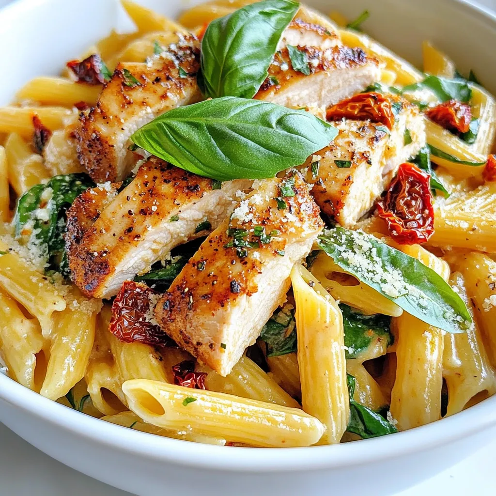 A creamy and flavorful pasta dish featuring chicken, sun-dried tomatoes, and fresh spinach, perfect for a romantic dinner.