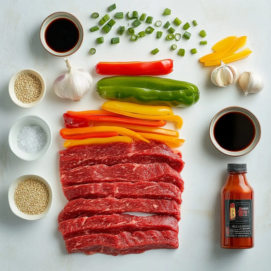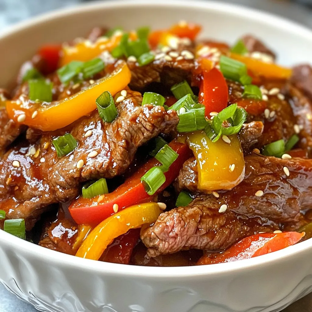 A vibrant and spicy stir-fry featuring tender flank steak and colorful vegetables, perfect for a quick meal.