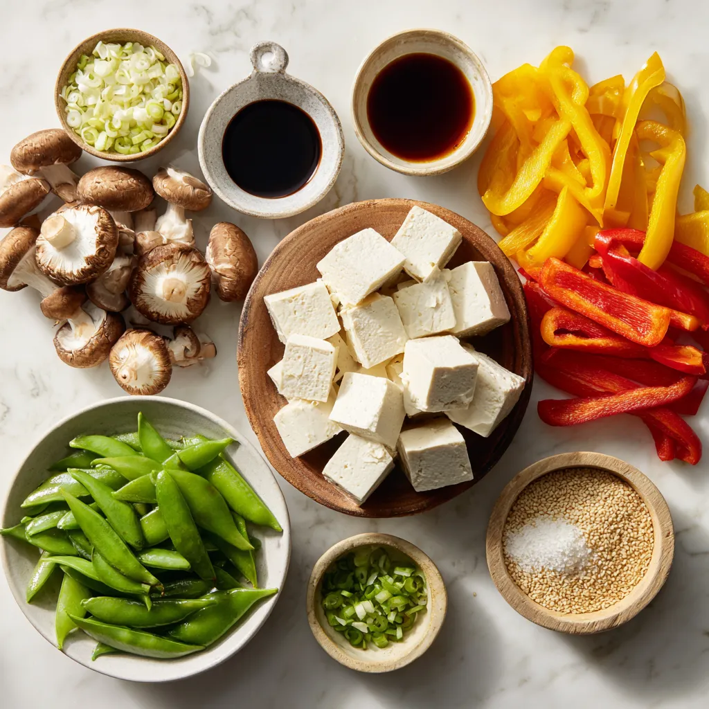 For a great mushroom tofu stir fry, you need: - 1 block of firm tofu, pressed and cut into cubes - 2 cups mixed mushrooms (shiitake, cremini, oyster), sliced - 1 bell pepper (red or yellow), sliced into strips - 1 cup snap peas, trimmed - 3 green onions, chopped - 2 cloves garlic, minced - 1 tablespoon fresh ginger, grated - 3 tablespoons soy sauce (or tamari for gluten-free) - 1 tablespoon sesame oil - 1 tablespoon olive oil - 1 teaspoon cornstarch mixed with 2 tablespoons cold water - Sesame seeds for garnishing - Salt and black pepper to taste These fresh ingredients help build layers of flavor, making each bite delightful. You can boost flavor with extras like: - Chili flakes for heat - Fresh herbs like cilantro for brightness - Additional vegetables, such as carrots or broccoli - A squeeze of lime juice for a tangy kick These options let you customize your dish to your liking and make it unique. For the best results, use oils that can handle heat. I suggest: - Olive oil for frying - Sesame oil for flavor These oils work well together, giving your stir fry a rich taste. They help create a nice sear on the tofu, enhancing the dish's overall texture and flavor. {{ingredient_image_2}} Start by pressing the tofu. This step is key. It removes excess moisture. Wrap the tofu block in a clean kitchen towel. Place a heavy object on top. Let it sit for about 15 minutes. After pressing, cut the tofu into uniform 1-inch cubes. This size helps it cook evenly. Next, heat a large skillet or wok over medium-high heat. Add olive oil once the pan is hot. When the oil shimmers, gently add the cubed tofu. Spread it in a single layer. Cook until golden brown, about 5 to 7 minutes. Turn the tofu occasionally for even browning. Once browned, remove the tofu and set it aside. In the same skillet, add minced garlic and grated ginger. Sauté for about 30 seconds until fragrant. Then, stir in sliced mushrooms and bell pepper. Cook for 4 to 5 minutes. The mushrooms should soften and release their juices. Stir occasionally to cook evenly. Add snap peas next. Stir-fry for an additional 2 to 3 minutes. You want them bright green but still crisp. Now, return the browned tofu to the skillet. Pour soy sauce and sesame oil over the mixture. Toss everything to coat well. If you want a thicker sauce, add the cornstarch slurry slowly. Stir continuously as you pour. Cook for one more minute until the sauce thickens. Taste the stir-fry and season with salt and black pepper. Adjust to your liking. Remove from heat. Garnish with chopped green onions and sesame seeds. This adds color and flavor. Serve hot and enjoy your tasty Mushroom Tofu Stir Fry! Tofu can turn out perfect if you follow a few steps. First, press the tofu well. This removes extra moisture. It helps the tofu brown nicely. Cut the tofu into even cubes. This ensures uniform cooking. Use high heat when frying. This creates a nice, crispy crust. Avoid overcrowding the pan. Cook in batches if needed. This way, each piece gets golden brown. Marinades can boost the taste of your stir fry. A simple marinade can be made with soy sauce, sesame oil, and ginger. Let the tofu soak for at least 15 minutes. This adds depth to the flavor. You can also try adding garlic or chili paste for heat. Don’t skip the sauce while cooking. It brings everything together in a tasty way. This stir fry pairs well with many sides. Serve it with steamed jasmine rice or fluffy quinoa. Both options soak up the sauce well. For a crunch, add a fresh salad on the side. A light cucumber salad works great. You can also serve it with spring rolls. These add an extra layer of flavor and texture. Enjoy this meal with friends or family for a delightful dining experience! Pro Tips Press Tofu Well: Ensuring that the tofu is thoroughly pressed will help it achieve a perfect crispy texture when frying. The longer you press, the better! Use Fresh Ingredients: Whenever possible, use fresh vegetables and herbs for the best flavor. This will enhance the overall taste of your stir-fry. Control the Heat: Keep the heat at medium-high to achieve that nice sear on the tofu and vegetables. Too low and they will steam instead of fry. Customize Your Sauce: Feel free to experiment with the sauce ingredients by adding chili paste, or swapping soy sauce for coconut aminos for a different flavor profile. {{image_4}} You can boost your stir-fry with more protein. Tempeh and seitan are great choices. Tempeh offers a hearty texture and nutty taste. Cut it into small cubes like the tofu. Sauté it until golden. Seitan has a chewy feel and absorbs flavors well. Slice it thin and fry it until crisp. Both options make your dish more filling and nutritious. Feel free to mix in other vegetables. Carrots add sweetness and color. Broccoli gives crunch and nutrients. Zucchini brings a mild flavor that blends well. You can also try baby corn or bell peppers in different colors. Each vegetable adds its unique taste and texture. Experiment and find your favorite combo. You can change the flavors with a few easy tweaks. Adding nuts like cashews or peanuts adds crunch and richness. Toss them in just before serving. You can also add sauces like hoisin or chili paste for extra depth. A splash of rice vinegar can brighten the dish. These small changes can give you a whole new taste experience. Enjoy being creative! To keep your Mushroom Tofu Stir Fry fresh, store it in an airtight container. Make sure it is cool before sealing. You can refrigerate it for up to three days. Avoid leaving it out for too long at room temperature, as this can cause spoilage. When you're ready to enjoy leftovers, reheat the stir fry on the stove. Place it in a skillet over medium heat. Stir it often to ensure even heating. You can also add a splash of water or soy sauce to keep it moist. Heat until it's warmed through, usually about 5-7 minutes. If you want to freeze your stir fry, let it cool completely first. Then, transfer it to a freezer-safe bag or containe
