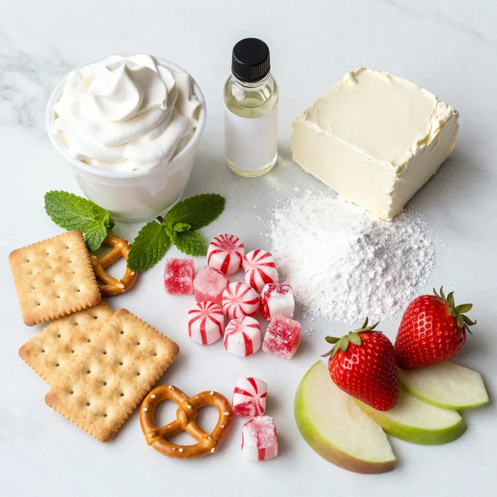 To make the best peppermint fluff dip, gather these ingredients first. Marshmallow fluff brings sweetness, while cream cheese adds creaminess. The powdered sugar sweetens the mix. Peppermint extract gives that classic mint flavor. Crushed peppermint candies add a fun crunch. Whipped topping makes it light and fluffy.
