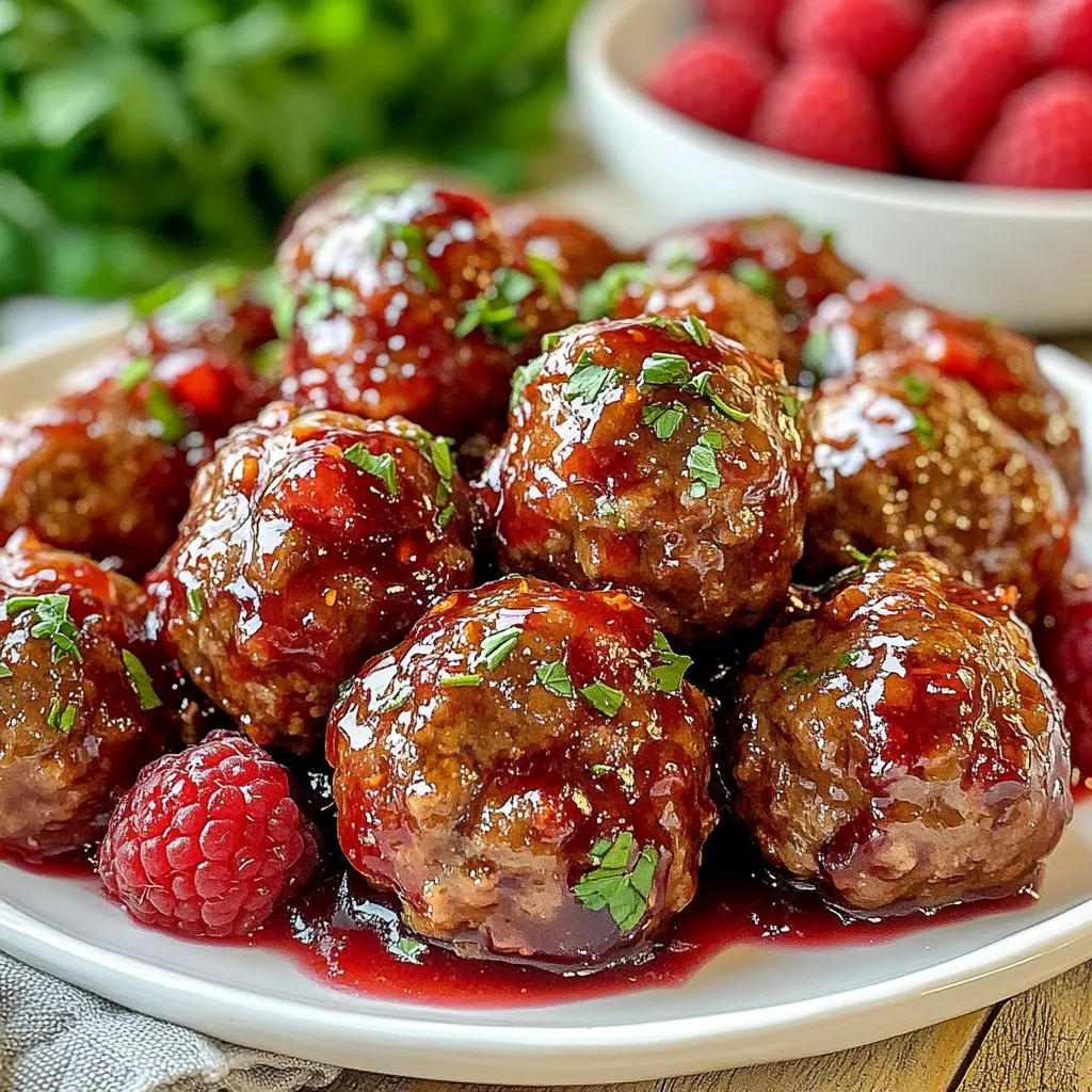 For a beautiful presentation, serve the meatballs on a large platter. Drizzle them with extra raspberry glaze for shine. Garnish with fresh raspberries and chopped parsley to add color.