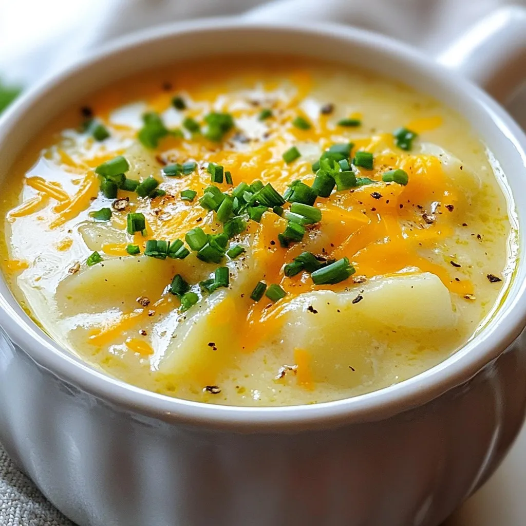 A creamy and flavorful potato soup infused with sharp cheddar cheese and garlic.