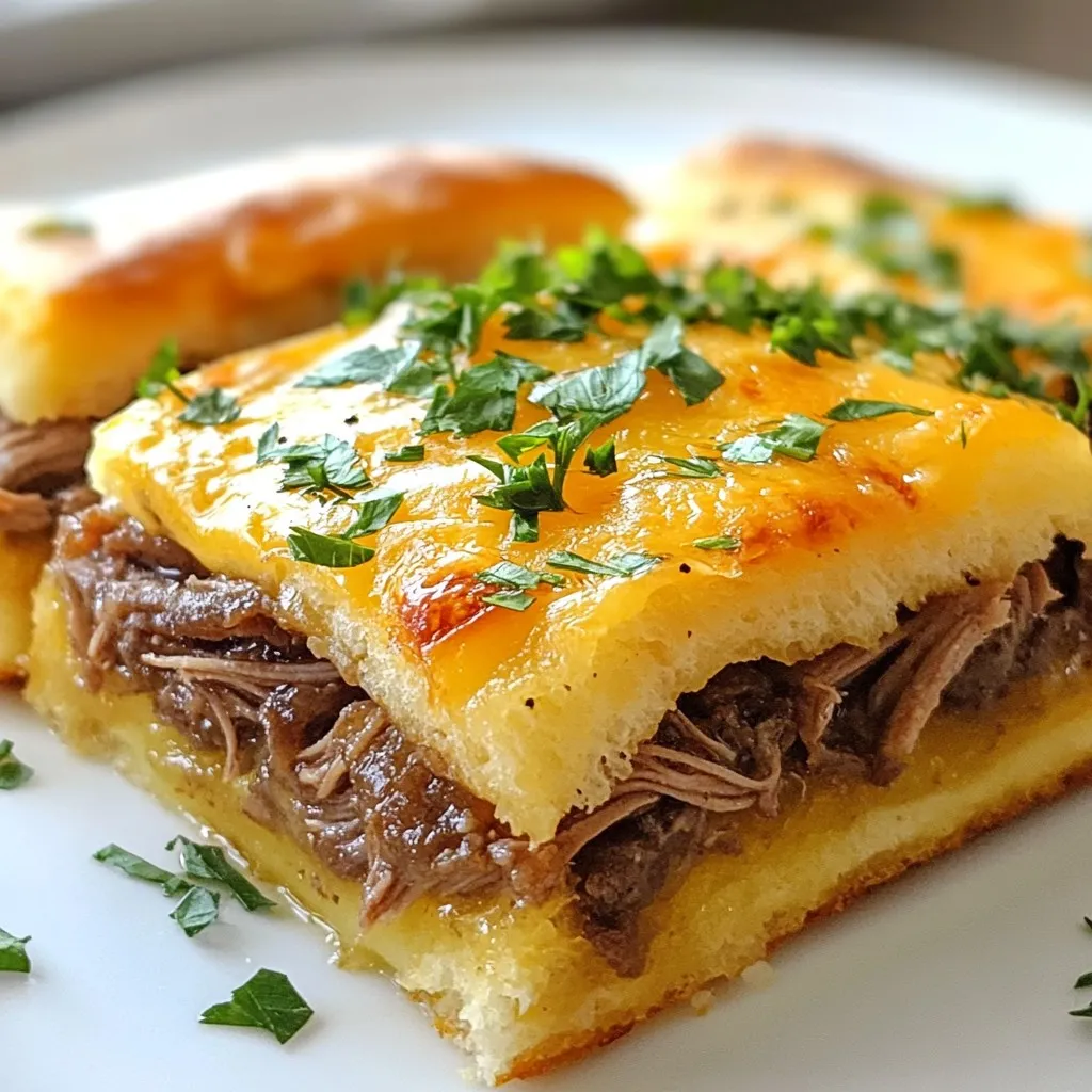 Savory squares filled with shredded beef and topped with Swiss cheese, perfect for a hearty meal.