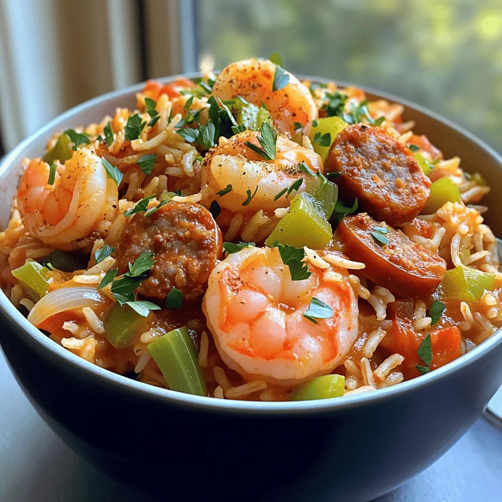 ![- 1 lb shrimp, peeled and deveined - 1/2 lb smoked sausage, sliced into rounds - 1 cup long grain rice - 1 medium onion, finely chopped - 1 green bell pepper, diced - 2 celery stalks, diced - 3 cloves garlic, minced - 1 can (14.5 oz) diced tomatoes with green chilies - 4 cups chicken broth - 2 tablespoons Cajun seasoning - 1 teaspoon dried thyme - 1 teaspoon paprika - 1 bay leaf - 2 tablespoons olive oil - Salt and black pepper, to taste - Fresh parsley, chopped (for garnish) Fresh shrimp gives the best flavor and texture. I always choose shrimp that’s bright pink and firm. Frozen shrimp works too, but thaw it safely in the fridge overnight. For sausage, I prefer smoked or Cajun sausage. Both add great depth to the dish. Cajun seasoning is a key flavor in jambalaya. It usually blends paprika, cayenne, garlic powder, and herbs. This adds a nice kick to your meal. Dried thyme and paprika enhance the taste too. If you don’t have Cajun seasoning, you can mix your own or use a store-bought blend. Use a Dutch oven or a large pot for even cooking. A good knife and a cutting board are key for prep. Measuring cups help keep your ingredients right. Always wash your hands after handling raw shrimp. This keeps your kitchen safe and clean. First, gather all your ingredients. Chop the onion, bell pepper, and celery. Measure out the rice and spices. This step helps you cook faster. Keep your workspace clean to avoid mess. When handling raw shrimp, wash your hands. Use a separate cutting board for the shrimp. This will prevent cross-contamination. Heat olive oil in a large pot over medium heat. Add the sliced sausage and cook for about five minutes. The sausage should turn golden brown. Remove the sausage and set it aside. Next, add the chopped vegetables to the pot. Sauté them for 5-7 minutes until the onion is soft. Now, stir in the rice. Toasting it for two minutes adds flavor. Add diced tomatoes, chicken broth, and seasonings. Bring everything to a boil, then cover and reduce heat. Let it simmer for 20-25 minutes. You’ll know it’s done when the rice absorbs most of the liquid. Now, add the shrimp. Fold them gently into the pot. Cover again and cook for another 5-7 minutes. The shrimp should turn pink and opaque. This means they are perfectly cooked. Once the shrimp are ready, remove the bay leaf. Taste your jambalaya and adjust the salt and pepper. Stir in fresh parsley for color. For serving, use deep bowls. Top with extra parsley and a sprinkle of Cajun seasoning. This adds a nice visual touch and flavor. For the full recipe, check out the previous sections. - For a great jambalaya, make sure your rice is not too wet. - Use long-grain rice for a light, fluffy texture. - Rinse the rice before cooking to remove excess starch. - Avoid mushy rice by not stirring too much during cooking. - Cook shrimp until they turn pink; this takes about 5 minutes. - If you like spice, add cayenne pepper to the sausage mix. - For milder jambalaya, use less Cajun seasoning or omit it. - Fresh shrimp have the best taste, so buy them from local markets. - Look for shrimp that smell sweet, not fishy. - Quality sausage adds great flavor; choose smoked or Andouille sausage. - Visit farmers' markets for fresh produce like bell peppers and onions. - Supermarkets can have good options, but local shops often have better quality. - Marinate shrimp in lemon juice and garlic for 15 minutes before cooking. - Add bell peppers, okra, or corn for extra flavor and texture. - Homemade chicken broth gives a richer taste than store-bought. - Try using beer instead of broth for a unique twist. - Adjust the cooking time based on any added vegetables or meats. For the full recipe, check out the Spicy Shrimp & Sausage Jambalaya section. {{image_4}} You can swap shrimp for many other proteins. Chicken works great in jambalaya. Just cut it into bite-sized pieces. Cook it longer than shrimp, about 10-15 minutes, until it is no longer pink. If you prefer a meatless dish, tofu is a tasty option. Use firm tofu and cube it. Sauté it for a few minutes before adding it to the jambalaya. For seafood lovers, try scallops or crab for a fun twist. Just remember to adjust the cooking time to avoid overcooking. Want more heat? You can add cayenne pepper or a splash of hot sauce. Mix in extra spices, too, like crushed red pepper flakes. For a fresh taste, add herbs like basil or oregano. Swap out the Cajun seasoning if you want a different flavor profile. You can use Creole seasoning or even a mix of paprika and garlic powder. Each region has its own spin on jambalaya, so feel free to experiment! Making jambalaya gluten-free is simple. Just choose gluten-free sausage or skip it altogether. For a vegan version, use vegetable broth and omit any meat. Replace shrimp with extra veggies or tofu. You can also make low-calorie jambalaya by using less oil and more veggies. Cut down on sausage and shrimp portions, too. This keeps the dish flavorful but light! Storing leftover jambalaya is easy. First, let it cool to room temperature. Then, place it in an airtight container. This keeps it fresh. You can store it in the fridge for up to three days. If it smells sour or looks off, it’s best to toss it. When reheating, use the stove or microwave. Add a splash of broth to keep it moist. To freeze jambalaya, portion it into smaller containers. Make sure they are freezer-safe. You can freeze it for up to three months. When ready to eat, take a portion out and let it thaw in the fridge overnight. For quick reheating, use the microwave or stovetop. Remember, shrimp can become rubbery if frozen too long, so enjoy sooner rather than later. Batch cooking jambalaya is a smart move. Make a large pot and divide it into portions. Store them in the fridge or freezer. This way, you have meals ready to go. Pair jambalaya with a simple salad or crusty bread for a complete meal. Fresh herbs or a squeeze of lemon can brighten the dish. This adds flavor and makes it feel fre