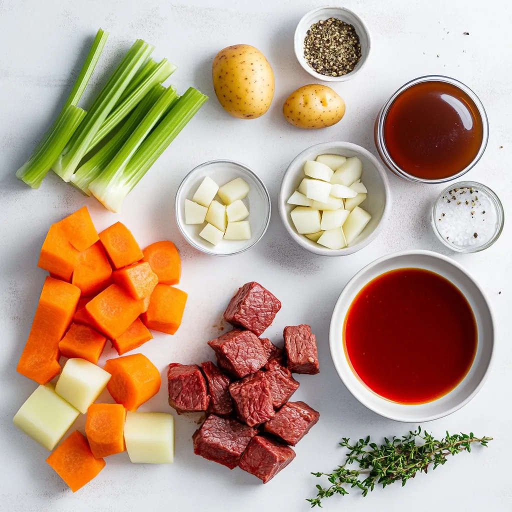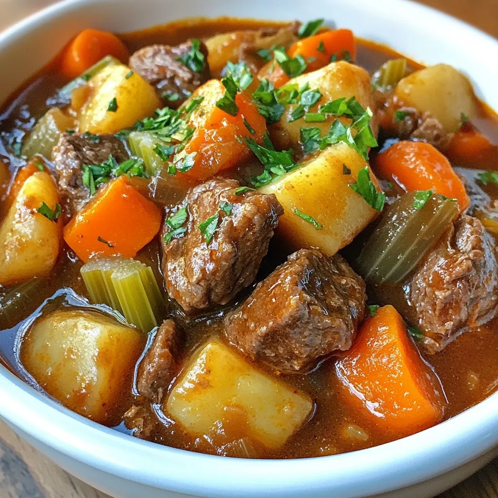 - 2 lbs beef chuck, cut into uniform 1-inch cubes - 4 large carrots, sliced into thick rounds - 3 celery stalks, diced into small pieces - 1 large onion, roughly chopped - 3 cloves garlic, minced finely - 4 medium potatoes, peeled and diced into 1-inch pieces - 4 cups beef broth (low-sodium recommended) - 2 tablespoons tomato paste - 1 tablespoon Worcestershire sauce - 1 teaspoon dried thyme - 1 teaspoon dried rosemary - Salt and freshly ground black pepper to taste - 1 bay leaf - 2 tablespoons olive oil (extra virgin for flavor) - Fresh parsley, chopped, for garnish You can add some fun twists to your stew. Consider these options: - 1 cup frozen peas for sweetness - 1 cup green beans for crunch - 1 cup mushrooms for earthiness - 1 tablespoon balsamic vinegar for depth Seasoning makes your stew shine. Besides thyme and rosemary, try these: - 1 teaspoon smoked paprika for a smoky touch - 1 teaspoon dried oregano for a herb boost - A pinch of cayenne pepper for heat - Fresh herbs like dill or basil for bright flavor Feel free to mix and match these ingredients. The key is to find what you love! {{ingredient_image_2}} Start by cutting the beef chuck into 1-inch cubes. This helps the meat cook evenly. Next, season the cubes with salt and freshly ground black pepper. This step adds a strong flavor to your beef, making it taste great. Heat 2 tablespoons of olive oil in a large skillet over medium-high heat. Once hot, add the beef cubes. Do this in batches to avoid crowding the pan. Brown the meat for about 5-7 minutes, turning it with tongs. This browning step is key. It locks in the juices and adds a rich flavor to the stew. After browning, transfer the beef to your slow cooker. Then, add in the sliced carrots, diced celery, chopped onion, minced garlic, and diced potatoes. Make sure everything is mixed well. This mix of vegetables gives the stew a hearty texture. Pour 4 cups of beef broth over the mixture in the slow cooker. Add 2 tablespoons of tomato paste and 1 tablespoon of Worcestershire sauce. Stir gently to combine. Then sprinkle in 1 teaspoon of dried thyme and 1 teaspoon of dried rosemary. Place a bay leaf in the mix for extra flavor. Secure the lid and set your cooker to low for 8 hours or high for 4 hours. Cooking on low makes the beef tender and juicy. When the cooking time is up, stir the stew well. Taste it and adjust with more salt or pepper if needed. Don’t forget to take out the bay leaf before serving. Ladle the stew into bowls and top with fresh parsley. This adds a nice pop of color and flavor. Enjoy your hearty meal! To boost the taste of your stew, start with seasoning. Use salt and pepper on the beef before cooking. Add fresh herbs like thyme or rosemary when you combine the ingredients. You can also toss in a splash of red wine for depth. A spoonful of sugar can balance the acidity of the tomatoes. Lastly, let it cook slowly. This helps all the flavors mix well. Browning the meat is key. When you sear beef in the skillet, it forms a crust. This crust adds a rich taste to the stew. It also keeps the meat juicy. Never skip this step; it makes a big difference. For best results, cook in batches. This prevents steam from forming, which can stop browning. You can swap ingredients based on what you have. If you don’t have beef chuck, try brisket or stew meat. For veggies, use mushrooms or green beans instead of carrots or celery. You can also use chicken broth instead of beef broth for a lighter flavor. Just keep in mind that these changes can affect the stew's taste. Serve your hearty beef stew in big bowls. Top each bowl with fresh parsley for color. I love to pair it with crusty bread. It’s perfect for soaking up the sauce. You can also add a simple salad on the side. This adds freshness and balances the rich stew. Enjoy the warmth and comfort it brings! Pro Tips Choose the Right Cut: Opt for beef chuck as it becomes tender and flavorful after slow cooking. It’s perfect for stews. Layer Flavors: Searing the beef before adding it to the slow cooker enhances the stew's overall flavor. Don't skip this step! Vegetable Variations: Feel free to add other vegetables like parsnips or mushrooms for added texture and flavor. Storage Tips: This stew freezes well! Portion it out and store in airtight containers for a quick meal later. {{image_4}} You can easily change the stew by adding different vegetables. Think about using parsnips, turnips, or sweet potatoes. Each vegetable gives a unique flavor and texture. You could also add green beans or peas for a pop of color. Just chop them into bite-sized pieces to match the other veggies. Beef chuck is great, but you can also try other proteins. If you want a lighter stew, use chicken thighs. They cook well in a slow cooker. For a fun twist, use lamb or pork. Both add a different taste that can surprise your guests. Just remember, different meats may need slight changes in cooking time. You can really play with flavors in this stew. For a spicy kick, add some red pepper flakes or diced jalapeños. If you prefer herbs, try adding fresh parsley or basil. You can also use a mix of spices like cumin or coriander for a different flair. These changes make every pot of stew an adventure. To store your leftover stew, let it cool first. Use airtight containers to keep it fresh. Make sure to leave a little space at the top of the container. This helps the stew stay safe and tasty. You can freeze beef stew for later. Portion it into freezer-safe bags or containers. Remove as much air as possible. Label each bag with the date. This way, you know when to use it. Beef stew can last up to three months in the freezer. When you are ready to eat your stew, take it out of the fridge or freezer. For fridge leftovers, heat on the stove over medium heat until warm. Stir often. If frozen, thaw it in the fridge overnight. Then reheat on the stove or in the microwave. Always check the temperature. It should be hot all the way through for safe eating. Ye