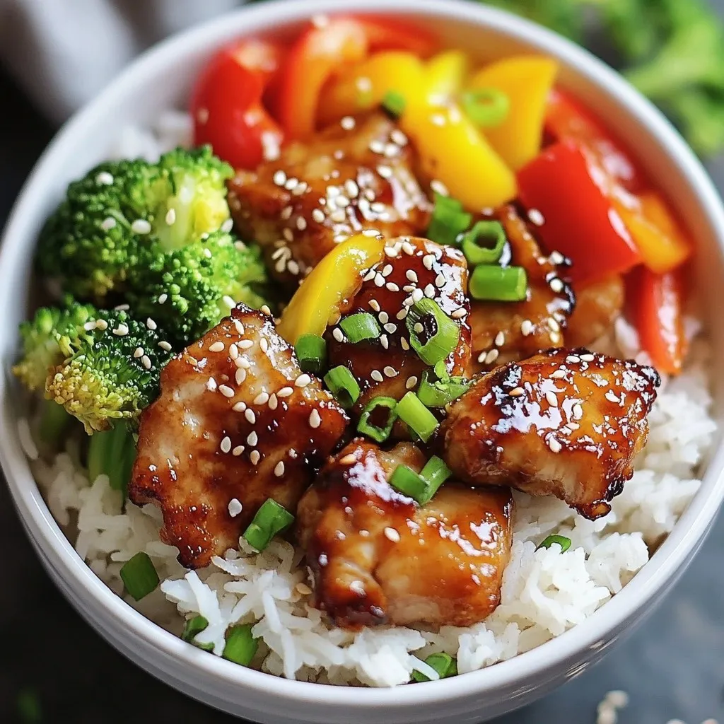 A delicious and savory rice bowl featuring marinated chicken, sautéed vegetables, and fluffy jasmine rice.