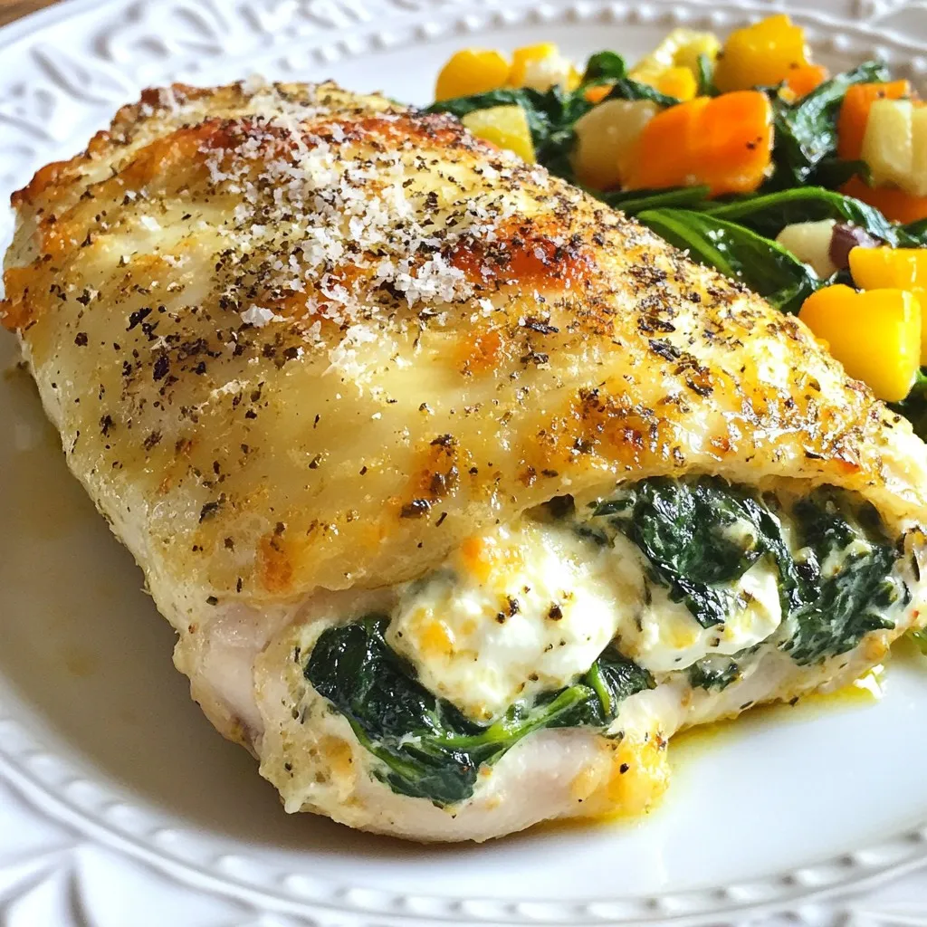 - 4 boneless, skinless chicken breasts - 2 cups fresh spinach, finely chopped - 1 cup ricotta cheese - ½ cup freshly grated Parmesan cheese - 1 clove garlic, finely minced - 1 teaspoon dried oregano - 1 teaspoon freshly grated lemon zest - Salt and pepper to taste - 2 tablespoons olive oil - ½ teaspoon red pepper flakes (optional for heat) These ingredients create a rich, creamy filling. The spinach adds color and nutrients. The cheeses bring a delightful creaminess. Garlic and lemon zest enhance the flavor. - Fresh herbs like parsley or basil for garnish - Additional spices like thyme or basil - A splash of lemon juice for brightness - Sun-dried tomatoes for a sweet, tangy taste These extras can elevate your dish. Fresh herbs add color and aroma. Extra spices let you customize flavor. - Sharp knife for pocketing chicken - Medium skillet for cooking spinach - Large mixing bowl for combining ingredients - Oven-safe skillet for searing and baking - Toothpicks for securing stuffed chicken Having the right tools makes cooking easier. A sharp knife helps you cut safely and neatly. An oven-safe skillet allows for smooth transitions from stovetop to oven. {{ingredient_image_2}} To start, gather all your ingredients. You will need: - 4 boneless, skinless chicken breasts - 2 cups fresh spinach, finely chopped - 1 cup ricotta cheese - ½ cup freshly grated Parmesan cheese - 1 clove garlic, finely minced - 1 teaspoon dried oregano - 1 teaspoon freshly grated lemon zest - Salt and pepper to taste - 2 tablespoons olive oil - ½ teaspoon red pepper flakes (if you want some heat) Next, preheat your oven to 375°F (190°C). This helps the chicken cook evenly later. In a medium skillet, heat 1 tablespoon of olive oil over medium heat. Add the minced garlic and sauté for about 1 minute. You want it to smell great but not burn. Then, toss in the chopped spinach. Cook for about 2-3 minutes until it wilts down. Once done, remove the skillet from heat and let the spinach mix cool a bit. In a large bowl, combine the wilted spinach, ricotta, Parmesan, oregano, lemon zest, red pepper flakes (if you chose to use them), and a pinch of salt and pepper. Stir until everything is creamy and well mixed. Now, take each chicken breast and carefully cut a pocket in it. Slice horizontally but don't cut all the way through. You want to hold the filling inside. Generously fill each chicken pocket with the spinach and cheese mix. Make sure it’s evenly spread. If needed, use toothpicks to secure the openings so the filling stays put. Heat the last tablespoon of olive oil in an oven-safe skillet over medium-high heat. When it’s hot, place your stuffed chicken breasts in the skillet. Sear them for about 3-4 minutes on each side until they are golden brown. Once seared, carefully transfer the skillet to your preheated oven. Bake for 25-30 minutes until the chicken reaches an internal temperature of 165°F (75°C). When the chicken is done, take the skillet out of the oven. Let the chicken rest for about 5 minutes. Don’t forget to remove any toothpicks before serving. For a lovely presentation, serve the stuffed chicken on a bed of sautéed mixed vegetables or alongside creamy mashed potatoes. Add a sprinkle of fresh herbs for color and flavor. Enjoy your delightful dish! To cook chicken just right, follow these tips: - Use a meat thermometer. Aim for 165°F (75°C) inside. - Let the chicken rest. After cooking, rest it for 5 minutes. This keeps it juicy. - Don’t crowd the pan. Give each chicken piece space to cook evenly. You can cook spinach stuffed chicken in different ways: - Grilling. Grill on medium heat for a smoky flavor. Cook each side for 6-7 minutes. - Air frying. Preheat your air fryer to 375°F (190°C). Cook for about 20 minutes. This keeps the chicken juicy and adds a nice crisp. To make healthier choices, try these swaps: - Ricotta cheese. Substitute with low-fat cottage cheese for fewer calories. - Parmesan cheese. Use nutritional yeast for a dairy-free option. - Olive oil. Replace with a light cooking spray to cut down on fat. Pro Tips Use Fresh Ingredients: Fresh spinach and high-quality cheeses make a significant difference in flavor. Opt for ricotta and Parmesan that are freshly grated for a creamier texture. Don’t Overstuff: While it’s tempting to fill the chicken breasts to the brim, overstuffing can lead to the filling leaking out during cooking. Aim for a generous but manageable amount. Let it Rest: After baking, allow the chicken to rest for at least 5 minutes. This helps the juices redistribute, resulting in a juicier and more flavorful dish. Experiment with Herbs: Feel free to experiment with different herbs like thyme or basil in the stuffing. They can elevate the dish and add a unique twist to the flavor profile. {{image_4}} You can mix it up with different cheeses. Try using feta cheese for a tangy twist. Cream cheese can make the filling extra creamy. For a richer flavor, add some goat cheese. Each cheese gives the dish a unique taste. If you prefer a vegetarian meal, use large portobello mushrooms. Remove the stems and gills first. Then, fill them with the same spinach mixture. Bake until the mushrooms are tender. This option is hearty and satisfying, perfect for plant lovers. Get creative with herbs! Fresh basil or thyme adds nice flavor. You can also add seasonal vegetables. Chopped sun-dried tomatoes or artichokes enhance the filling's taste. Mixing in roasted red peppers can add a sweet touch. These small changes can make a big difference in flavor. To store leftover spinach stuffed chicken breasts, let them cool to room temperature. After that, wrap each breast in plastic wrap or foil. Place them in an airtight container. You can keep them in the fridge for up to 3 days. This method keeps the chicken moist and flavorful. When reheating, avoid drying out the chicken. Preheat your oven to 350°F (175°C). Place the stuffed chicken in an oven-safe dish. Add a splash of chicken brot