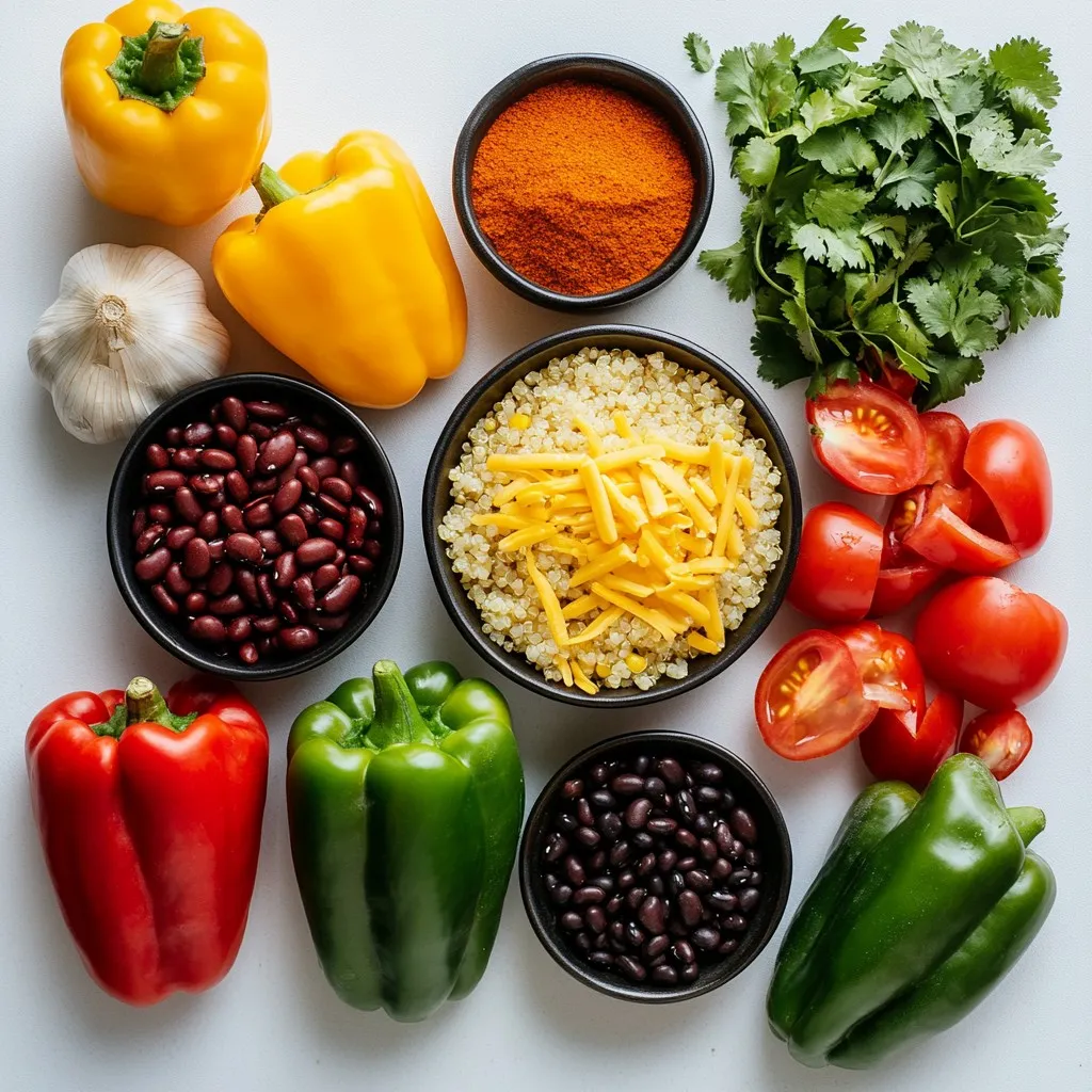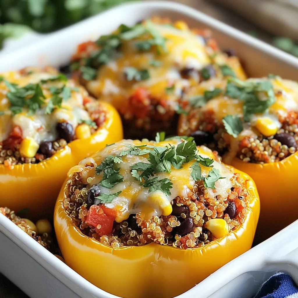 A colorful and nutritious dish featuring bell peppers filled with a savory quinoa and black bean mixture, topped with melted cheese.