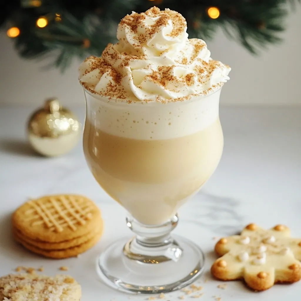A festive and creamy cocktail blending rich eggnog with vanilla almond milk, topped with whipped cream and spices.